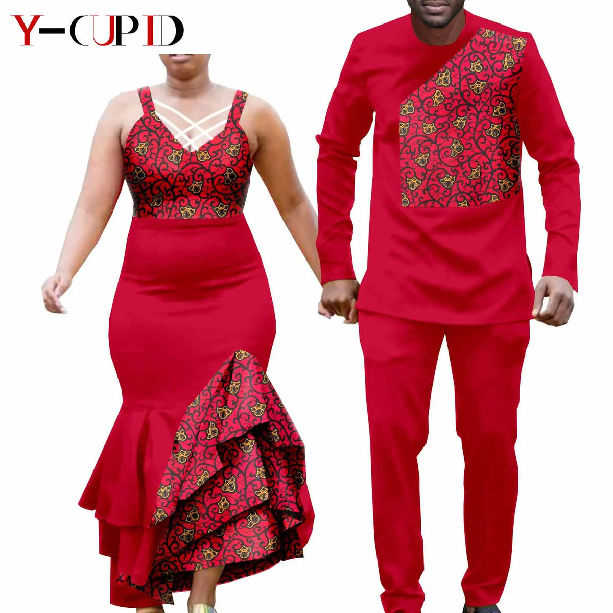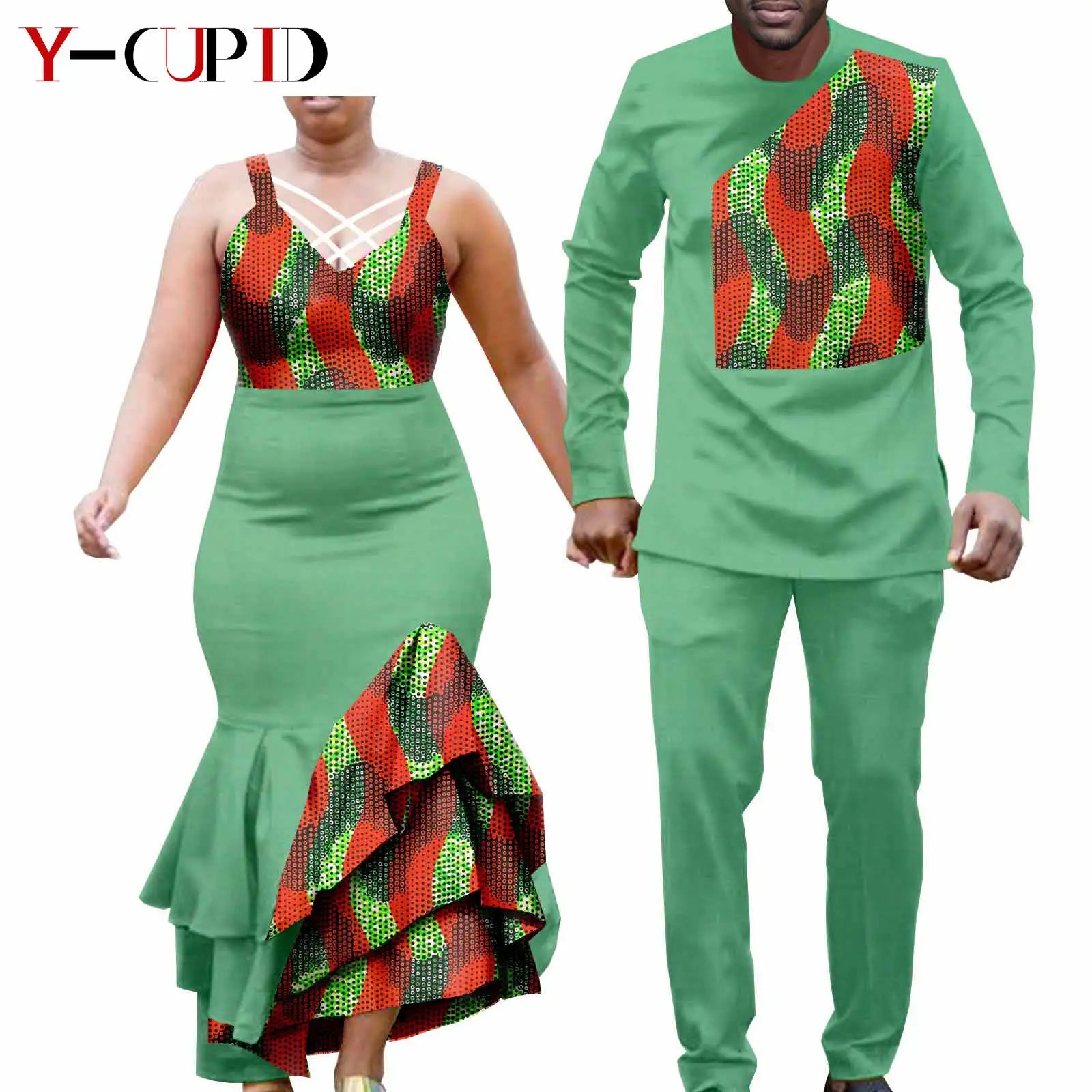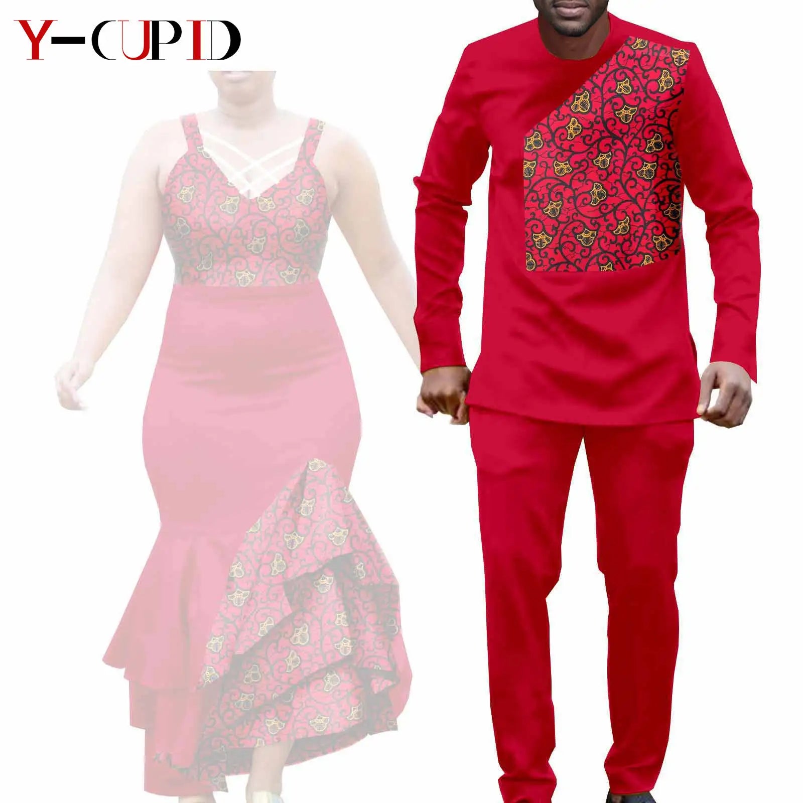 The men’s outfit includes a classic dashiki-style shirt paired with matching trousers, designed for both comfort and style. The bold patterns and tailored fit give a polished yet relaxed look, making it suitable for weddings, parties, or traditional ceremonies. Together, the set symbolizes connection and shared identity, making it ideal for couples who want to stand out in coordinated fashion.